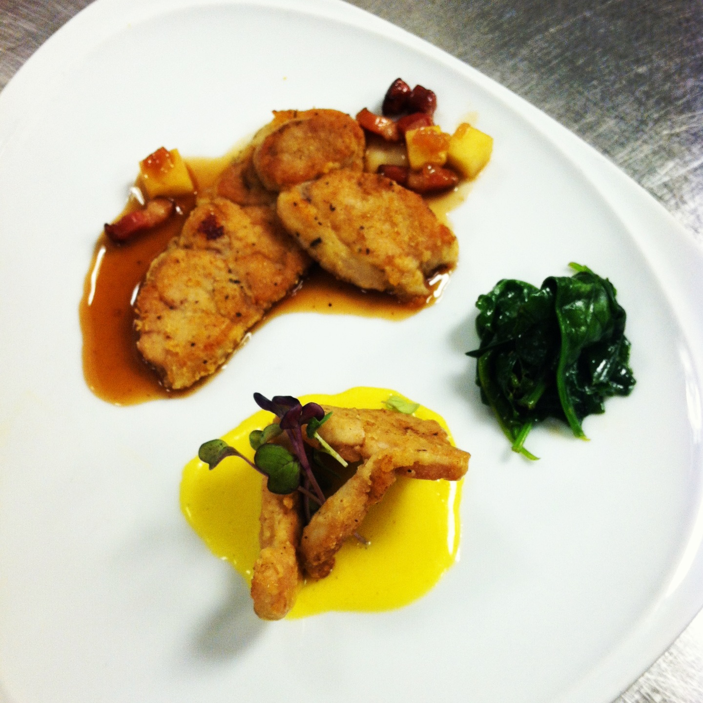 Sweetbreads with an apple, maple, bacon sauce as well as sweetbreads with maltaise sauce and a side of sautéed spinach.