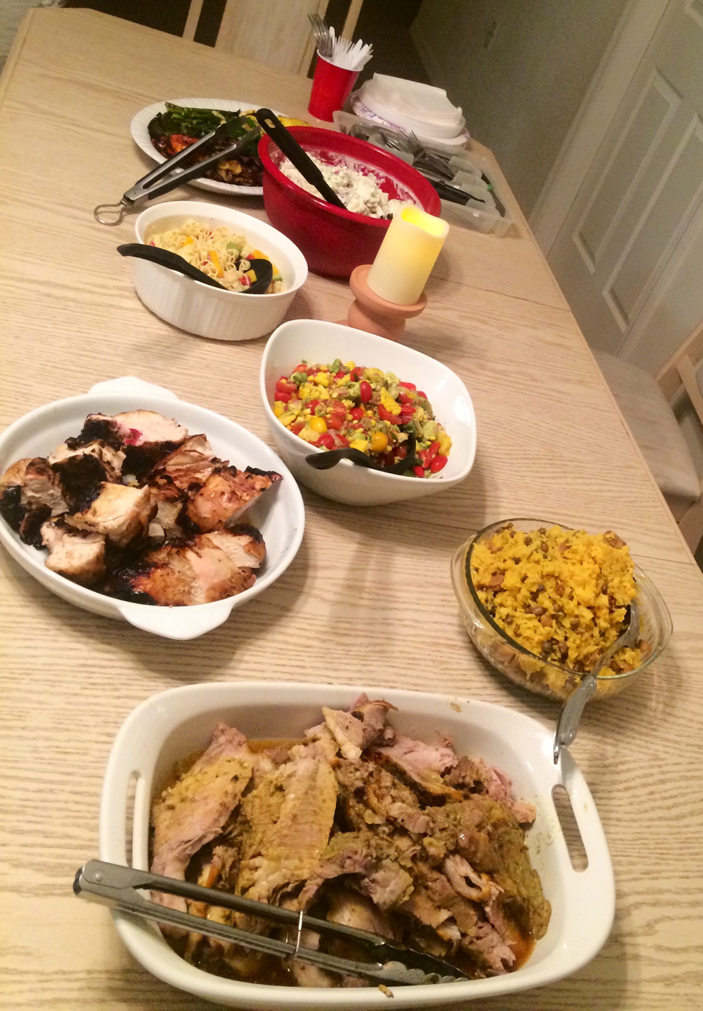 Last night I had the privilege of cooking for team USA’s women’s ball hockey team while they are down in Tampa fighting for the gold at the Master’s World Ball Hockey Championship. They are 3 and 0 and will play the Canadian national team this Sunday for the championship. Last night’s menu consisted of Puerto Rican roast pork shoulder, tequila lime chicken, fresh corn and avocado salad, pasta salad (bachelorette party themed,) potato salad, rice and beans, grilled asparagus, peppers, onions, zucchini and summer squash.